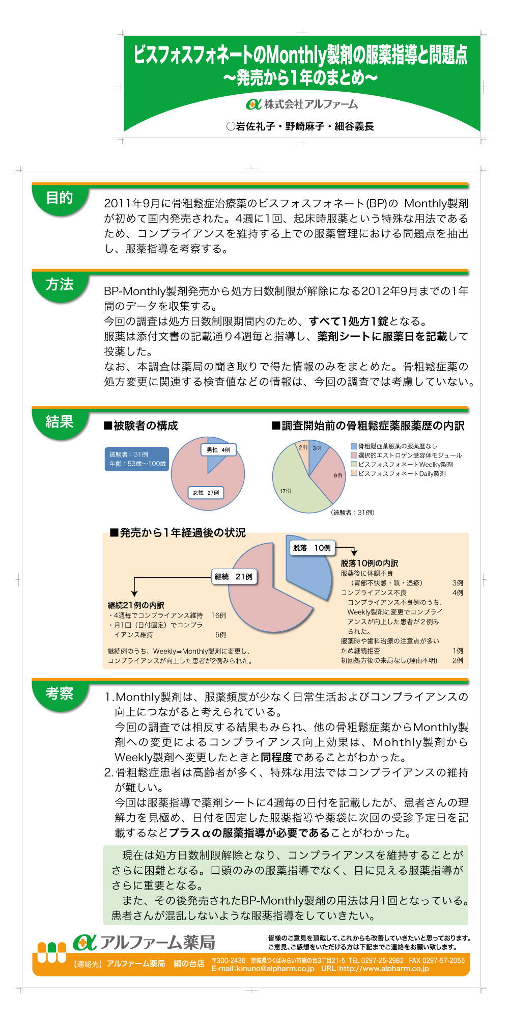 『ビスフォスフォネートのMonthly製剤の服薬指導と問題点〜発売から1年のまとめ〜』※ポスター発表